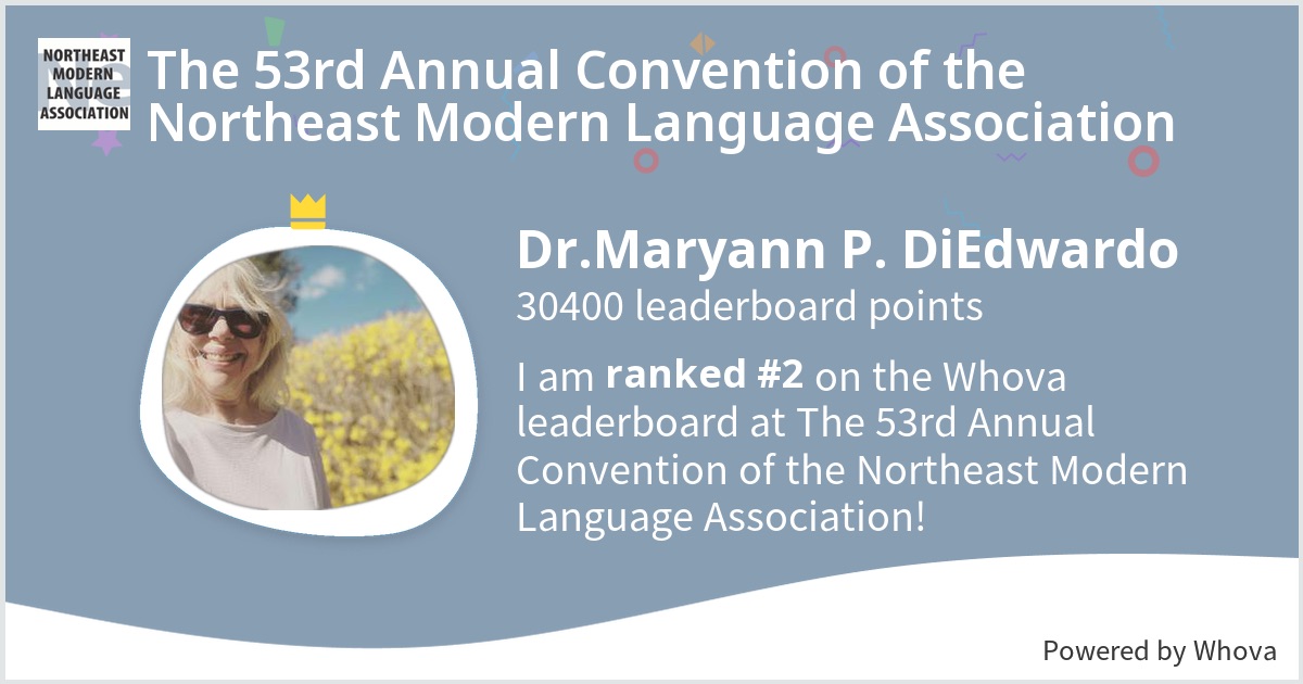 I ranked #2 on the Whova leaderboard at The 53rd Annual Convention of the Northeast Modern Language Association! #NeMLA22 – via #Whova event app