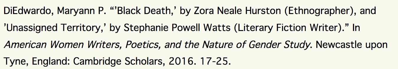 Zora Neale Hurston Digital Archive 2016 research credit – American Women Writers, Poetics, and the nature of gender study, Maryann P. DiEdwardo Editor. Chapter on Zora Neale Hurston and Stephanie Powell Watts